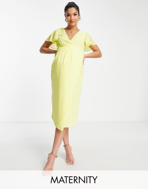 TFNC Maternity Bridesmaid chiffon wrap front midi dress with flutter sleeve in lemon yellow Very well made.